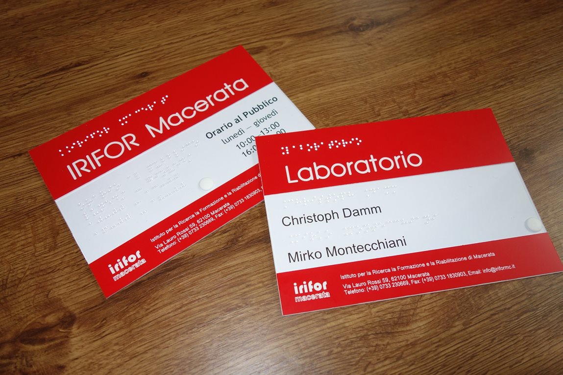 Po stránce technické se sami zabýváme pouze prvky uvedenými v bodě 1 a 2. Zde platí, že technologie používaná pro zhotovování plánů nebo samotného značení na místě a konkrétní provedení se vždy odvozuje od požadavků na trvanlivost a také na estetickou stránku věci. V případě hmatových plánů standardně nabízíme tři technologie zmíněné v kapitole Výroba hmatové grafiky, resp. podkapitole Technologie pro výrobu hmatové grafiky. Pro interiérové značení, které má mít trvalejší charakter a jistou estetickou hodnotu, preferujeme technologii vsazovaných brailleských bodů (ve své podstatě kuliček) do tvrdého podkladu z různých materiál (čirý či různě barevný plast – viz ukázky ve fotografické galerii na konce stránky).