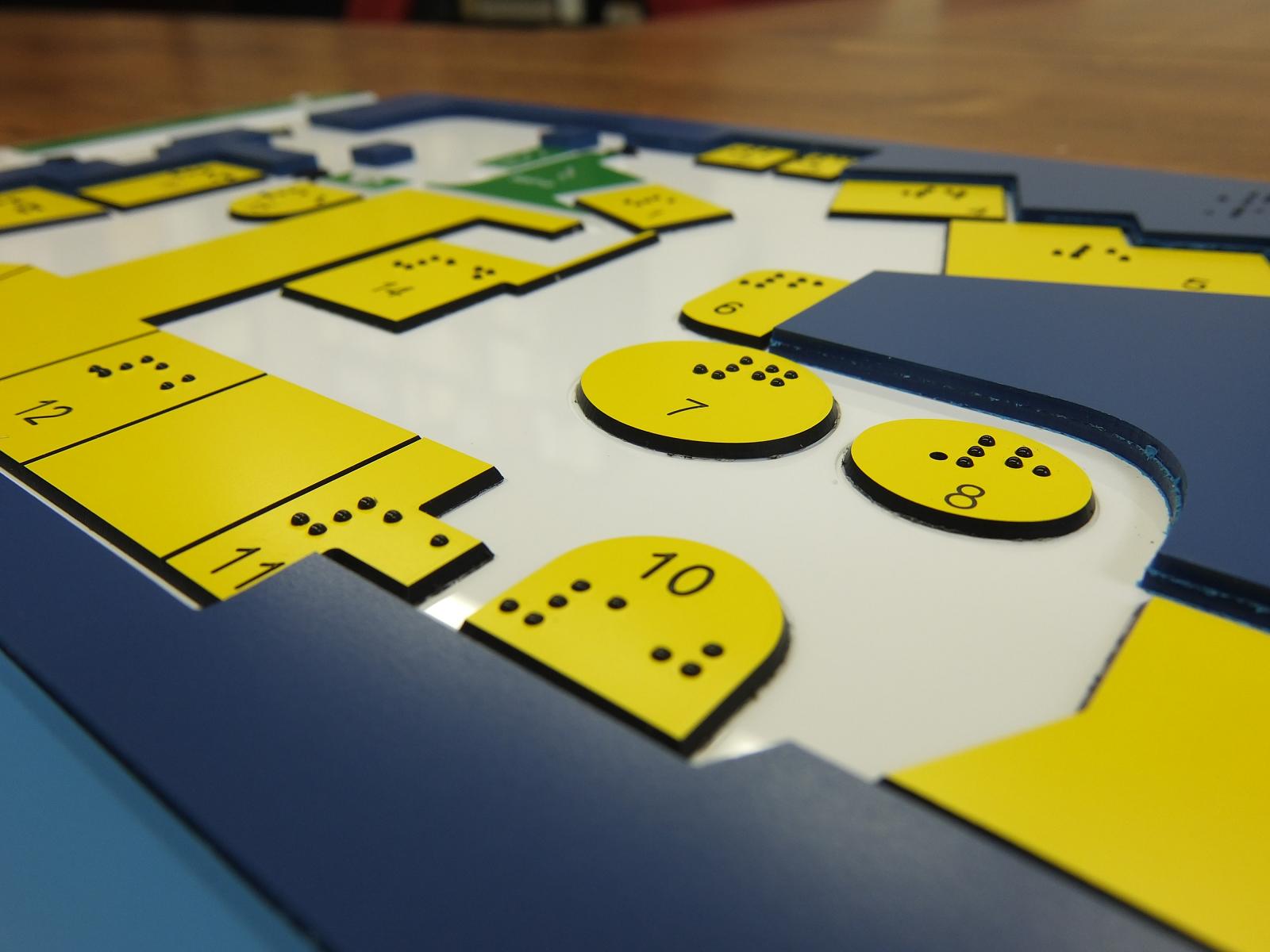 In terms of technical production, we only produce the first two mentioned navigation aids. Taking into account the desired durability of the product and also the aesthetic aspects, we select the appropriate method to produce tactile maps or individual signs. There are three technologies we employ to produce tactile maps. Please see the Tactile graphics production and its subsection Technologies used for production of tactile graphics. To produce indoor signs that are meant to be durable and have a certain aesthetic value, we prefer fitting the Braille dots in the form of round pellets (in fact, small beads) into the surfaces made out of different materials, such as plastic sheets that can be either of various colours or transparent (please see the gallery at the end of the page).